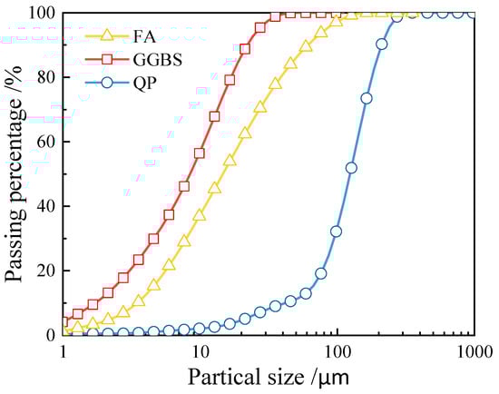 Figure 1 shows the raw materials used to prepare the EGC in this study, including Class F FA, S105 GGBS, quartz powder (QP), sodium hydroxide (SH), sodium silicate (SS), polyethylene fibers (PE fibers), domestic unoiled polyvinyl alcohol fibers (PVA fibers), barium chloride (BC), defoamer, and water. Class F FA and S105 GGBS conformed to the requirements of GB/T 51003—2014 [37]. Figure 2 displays the particle size distribution of FA, GGBS, and QP, determined through laser particle size analysis. Table 1 presents the chemical composition of FA and GGBS using X-ray fluorescence (XRF). X-ray fluorescence (XRF) is an analytical technique used to determine the elemental composition of materials, which is based on the principle that individual elements emit characteristic “secondary” (or fluorescent) X-rays when they are excited by high-energy X-rays or gamma rays.