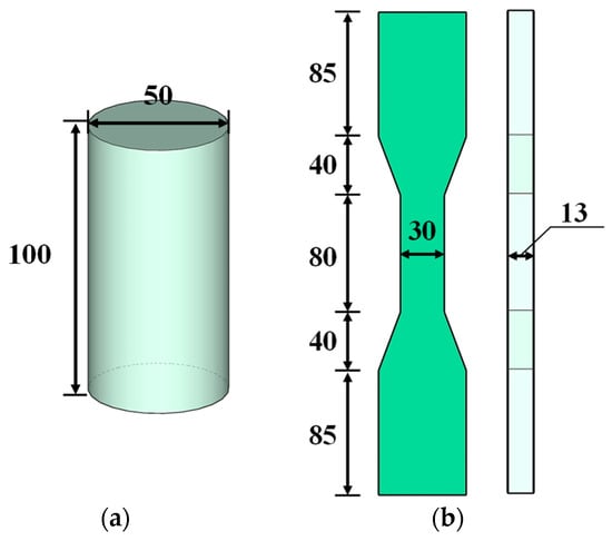 Specimens used for testing the basic mechanical properties of EGC: (a) axial compression test; (b) axial tension test (dimensions in mm).