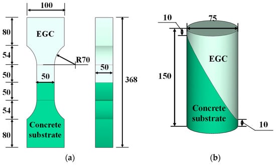 Specimens adopted for bonding behavior between EGC and concrete substrate: (a) direct tension test; (b) compressive slant shear test (dimensions in mm).