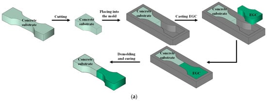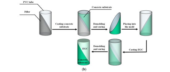 Preparation of specimens adopted for bonding behavior between EGC and concrete substrate: (a) direct tension test; (b) compressive slant shear test.