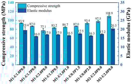 Figure 6 illustrates the variations in compressive strength and elastic modulus of hybrid fiber EGCs across different FA/GGBS ratios and hybrid fiber ratios. Overall, the compressive strength and elastic modulus of the prepared hybrid fiber EGC in this study ranged from 77.1 to 108.9 MPa and 16.0 to 20.3 GPa. Specifically, incorporating PE fibers alone resulted in a reduction in compressive strength as the PE fiber content increased. For example, increasing PE fiber content from 1.0% to 2.0% decreased compressive strength by 17.9%. Conversely, substituting PE fibers with PVA fibers led to a consistent increase in the compressive strength of the EGC. In particular, compared with M1-U2.0P0.0 (2.0% PE fibers), M1-U2.0P0.0 (2.0% PVA fibers) exhibited a 21.1% increase in compressive strength. Yet, it was observed that the elastic modulus of the EGC was influenced by PE fiber content and FA/GGBS ratio rather than the fiber hybrid ratio. Furthermore, Figure 6 shows that with identical fiber content, both the compressive strength and elastic modulus of the EGC increased with higher GGBS content. For example, M3-U2.0P0.0 (FA:GGBS = 5:5) exhibited a 16.6% increase in compressive strength and a 24.5% increase in elastic modulus compared with M1-U2.0P0.0 (FA:GGBS = 7:3).