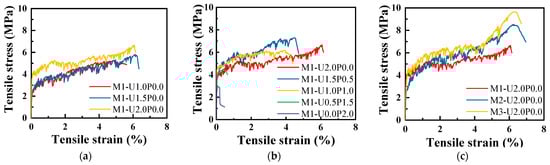 Figure 7 illustrates representative tensile stress–strain curves of EGC under different variations, highlighting the tensile performance of hybrid fiber EGC under various hybrid PVA/PE fiber ratios and FA/GGBS ratios. Most of specimens demonstrated significant strain-hardening behavior, capable of sustaining loads even after matrix cracking initiated. This behavior is essential for applications requiring high durability and resilience. However, notable exceptions were observed in specimens with higher PVA/PE fiber ratios. These specimens lost their crack-control ability, which is not acceptable in EGC-like materials, transitioning into a strain-softening stage soon after the initial cracking. This loss of tensile performance is crucial as it suggests limitations in the use of high PVA fiber content for certain structural applications. As depicted in Figure 7a, increasing the PE fiber content enhanced the tensile strength and ultimate tensile strain of the EGC, indicating that PE fibers contributed significantly to the material’s load-bearing capacity and tensile ductility. Conversely, it was observed with increasing PVA fiber content, the tensile performance of EGC gradually declined, with the material losing its characteristic tensile properties. Figure 7c indicates that reducing the FA/GGBS (increasing GGBS content) improved tensile performance, suggesting that GGBS played a vital role in improving the overall tensile behavior of the EGC. Overall, hybrid fiber ratios and FA/GGBS ratios were both demonstrated to affect the tensile properties of the EGC, implying that these two essential parameters should be chosen cautiously to preserve excellent tensile properties while saving costs.