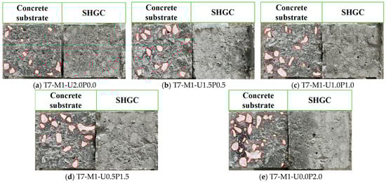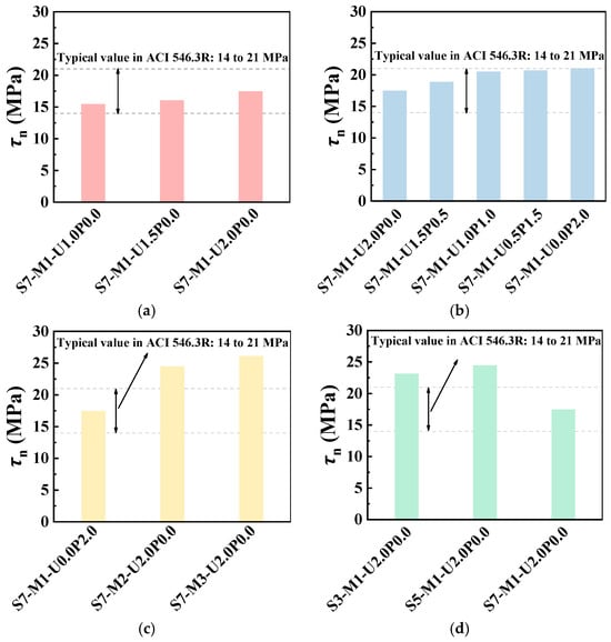 As the PE fiber content increased, the shear bond strength increased as well. For instance, with PE fiber contents of 1% (S7-M1-U1.0P0.0), 1.5% (S7-M1-U1.5P0.0), and 2% (S7-M1-U2.0P0.0), the shear bond strengths were 15.5 MPa, 16.0 MPa, and 17.5 MPa, respectively, which were 10.7%, 14.3%, and 25.0% higher than the minimum standard of ACI 546.3R [44]. Additionally, when the PE fiber content of EGC was 2.0%, the shear bond strength increased by 3.2% and 12.9% compared with that with 1.0% and 1.5% PE fiber content, respectively. Similarly, increasing the PVA fiber hybrid ratio, GGBS ratio, and concrete substrate strength grade all exerted positive influence on the shear bond strength. However, for the C70 concrete substrate, the shear bond strength was lower than that of specimens with C30 and C50 concrete substrates.