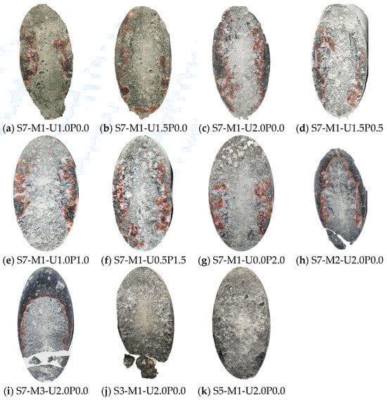 Figure 9 illustrates the failure modes of the interface specimens on the concrete substrate side in the compression shear test, with dark-colored areas representing the concrete substrate. Despite showing only the concrete substrate side after specimen failure, it was evident that the concrete substrate side and EGC side of specimens maintained fundamentally good integrity. However, fractures in the concrete substrate occurred when there was a significant strength difference between the concrete substrate and the repair EGC. Integrity is defined as the condition of the concrete substrate and repair material; cracks or fractures in either indicate poor integrity. The integrity of both sides also reflects the sequence of failure at the bonding interface. Good integrity suggests that damage first occurs at the interface. Thus, as the bonding performance improves, the integrity of the substrate and repair mortar decreases. In this study, the fractures observed on the concrete substrate side of S7-M2-U2.0P0.0, S7-M3-U2.0P0.0, and S3-M1-U2.0P0.0 indicated relatively good bonding performance, consistent with the calculated results. Therefore, it was concluded that the EGC showed better repair effects in the process of concrete rehabilitation, which was likely to have been due to the increased tensile strength of the EGC, leading to improved bonding performance.