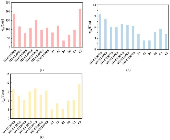 Table 8 shows the costs of raw materials used in hybrid fiber EGCs, based on bulk commodity prices for laboratory-purchased raw materials. Note that the prices for laboratory-purchased raw materials are generally higher in terms of purchasing amount and shipping costs. Table 9 compares the hybrid EGC mix proportions studied here, focusing on key axial compression and tension performance parameters (compressive strength , tensile strength , ultimate tensile strain ) as economic indicators. The impact of different PVA/PE ratios on the economic efficiency of EGCs with hybrid fibers was analyzed, with the price of oiled PVA fibers sourced from reference [45]. Cost comparisons with EGCs from other studies were also conducted [27,46,47]. However, shear bond strength data are not included in the reported comparison because variations in casting methods, interface roughness, and test methods significantly affected the bonding performance of the EGC–concrete interface.