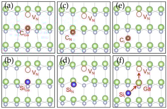 The structure of defect pairs formed by combining impurity atom defects with intrinsic point defects: (a) CGaVN, (b) SiGaVN, (c) CNVN, (d) SiNVN, (e) CiVN, and (f) SiiVN. The green, grey, brown and blue represent gallium, nitrogen, carbon and silicon atoms respectively.