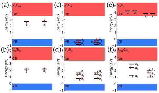 The band structure of defect pairs: (a) CGaVN, (b) SiGaVN, (c) CNVN, (d) SiNVN, (e) CiVN, and (f) SiGaGaN. The red arrow represents the direction of the electron’s spin.