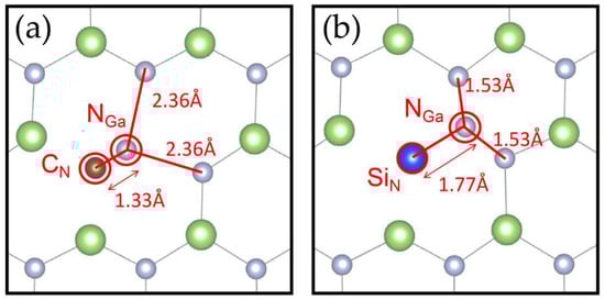 Carbon is one of the most prevalent unintentional dopants in GaN. The introduction of carbon is almost inevitable during the preparation of GaN thin films using processes such as metal-organic vapor phase epitaxy. For instance, when dimethylgallium and dimethylamine are employed as sources for gallium and nitrogen, respectively, there is a certain probability that carbon atoms from these gases will be incorporated into the fabricated GaN thin film [18,19,20]. The intentional doping of GaN is also a common method to adjust its physicochemical properties in experimental and production settings. For example, silicon, which belongs to the same group as carbon, is one of the most commonly used intentional dopants in GaN [21,22,23]. The incorporation of silicon can significantly increase the electron concentration in GaN, conferring upon it the characteristics of an n-type semiconductor. The incorporation of these newly introduced impurity atoms can result in the formation of defects in the form of substitutions or interstitials. Furthermore, they can combine with intrinsic point defects to form defect pairs [24,25]. Consequently, the existence of these doping atoms can affect the defect levels of GaN single-photon sources, thereby altering their single-photon emission.