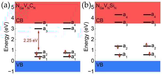The band structure of (a) NGaVNCN and (b) NGaVNSiN. The red arrow represents the direction of the electron’s spin.
