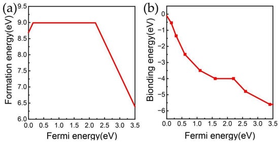 where Ef(NGaVNCN), Ef(NGaVN), and Ef(CN) are the formation energies of NGaVNCN, NGaVN, and CN, respectively. As shown in Figure 5b, the binding energy decreases with increasing the Fermi level and are always less than zero. This implies that once the NGaVNCN defect is formed, it requires additional energy absorption for separation.