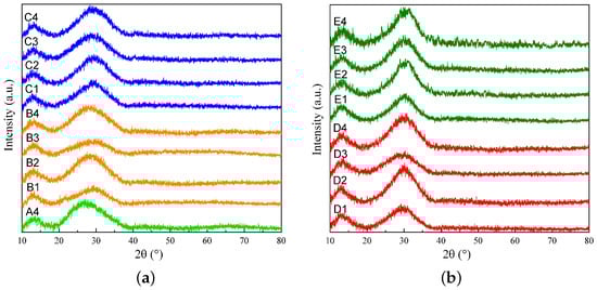 The results of the XRD analysis are presented in Figure 1; those for slags A4, B1 to B4, and C1 to C4 are shown in Figure 1a, and those for slags D1 to D4 and E1 to E4 are shown in Figure 1b. The XRD analysis shows that there are no crystalline peaks in the patterns, indicating that the quenched samples are in the glassy phase. The glassy state denotes the amorphous, non-crystalline structure that occurs when the molten slag is rapidly quenched. In contrast to crystalline materials, which possess a long-range ordered atomic structure, glassy materials are specified by a lack of periodic atomic arrangement, preserving the high-temperature structure of the slag [7,25].