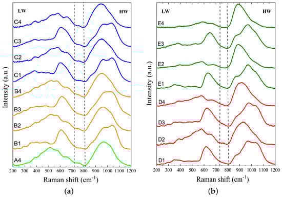 In this section, the results of analyzing the different Qn species () obtained using the deconvolution of Raman spectra in the high-wavenumber range of 800 to 1200 are presented. Figure 4 and Figure 5 display the fitting results for slags B1 to B4 and C1 to C4 and for slags D1 to D4 and E1 to E4, respectively. The bands of Q2 and Q3 species are predominant in slags without Al2O3 in groups B, C, and D, while the substitution of 17 wt% SiO2 by Al2O3 leads to a decline in Q3 and an increase in the Q1 and Q2 bands. In group E, the dominant band is Q2 for slags without Al2O3, while the predominant bands are Q0 and Q1 for slags containing Al2O3. In general, the study shows that the Raman spectra of slags containing SiO2 and slags containing both SiO2 and Al2O3 behave differently, while the Raman spectra of slags with CaO and slags with both CaO and MgO are relatively similar. Additionally, as the contents of SiO2 and Al2O3 are reduced, the Raman spectra in the high-wavenumber range shift to the left-hand side, and Qn species with less bridging oxygen become predominant.
