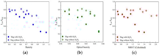 Variations in the R parameter (/) against basicity, optical basicity, and calculated NBO/T are illustrated in Figure 3a–c. The slags containing and not containing Al2O3 are represented by solid circles and open circles, respectively. As seen in Figure 3, the R parameter decreases as basicity, optical basicity, and NBO/T increase for slags that contain Al2O3, which is consistent with previous studies [23,43,44]. For slags without Al2O3, such as the MnO-SiO2-CaO and MnO-SiO2-CaO-MgO systems, the R parameter decreases slightly with increasing basicity, optical basicity, and NBO/T.
