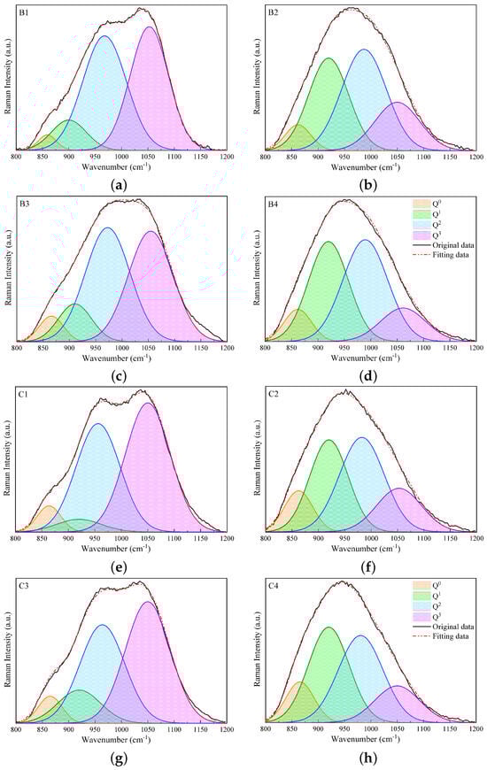 Fitting results of Raman spectra in the high-wavenumber region, i.e., 800–1200 , using Gaussian functions for slags B1 to B4 (a–d) and C1 to C4 (e–h).