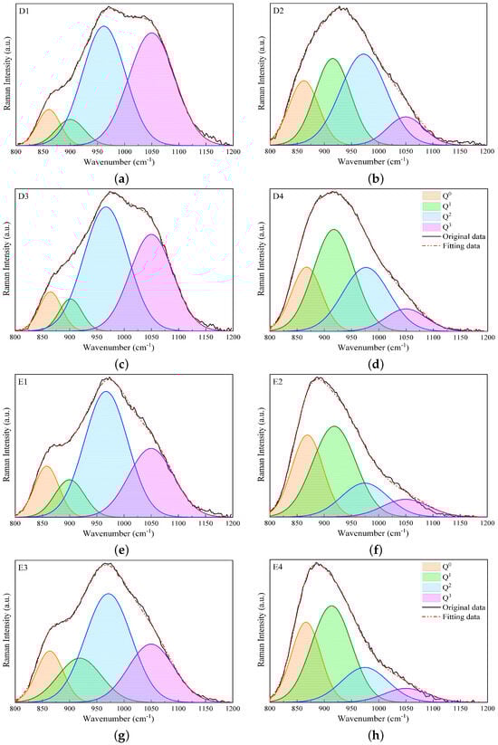 Fitting results of Raman spectra in the high-wavenumber region, i.e., 800–1200 , using Gaussian functions for slags D1 to D4 (a–d) and E1 to E4 (e–h).