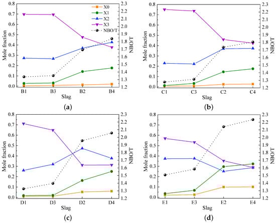 Variations in mole fractions for Qn species (X0, X1, X2, and X3) and values obtained from the deconvolution of Raman spectra for (a) slags in group B, (b) slags in group C, (c) slags in group D, and (d) slags in group E.