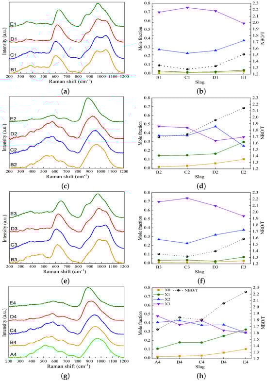 Figure 7 presents the Raman spectra as a function of wavenumbers, the variations in Xn species, and the values for the studied slag systems. For the MnO-SiO2-CaO slag system, the Raman spectra are displayed in Figure 7a. In the high-wavenumber range of 800 to 1200 , the Raman spectra for slags B1 and C1 exhibit two peaks at ∼960 and ∼1050 , corresponding to Q2 and Q3 bands, respectively, and a shoulder at 870 related to the vibrations of Q0 and Q1. As basicity increases, the intensity of the 1050 band decreases and the intensity of the 870 band increases, as seen in slag E1. Figure 7b shows that the mole fraction of X3 decreases and that of X2 increases to compensate for X3. This indicates that the silicate network is depolymerized by increasing the basicity at a fixed MnO content. These findings are consistent with Park’s research on the MnO-SiO2-CaO slag system [36]. For the MnO-SiO2-CaO-Al2O3 slag system, Figure 7c illustrates that the broad band in the high-wavenumber range shifts to the left-hand side as the basicity increases from slag B2 to slag E2. Therefore, the mole fraction of X3 decreases, while X1 and X0 increase, as seen in Figure 7d. The Raman spectral analysis of the MnO-SiO2-CaO-MgO slag system shown in Figure 7e,f is similar to that of the MnO-SiO2-CaO system. The results suggest that the substitution of 6 wt% CaO with MgO causes slight depolymerization in the silicate structure. For the MnO-SiO2-CaO-Al2O3-MgO slag system, the broad band in the high-wavenumber region shifts to the left-hand side with increasing basicity, as presented in Figure 7g. Figure 7f illustrates that the mole fractions of X1 and X0 continuously increase as the basicity increases. The substitution of 6 wt% CaO with MgO leads to depolymerization of the silicate network, as indicated by a comparison of Figure 7d,h. Figure 7 indicates that increases with increasing basicity, demonstrating a reduction in the degree of polymerization (DOP) of the silicate structure. The effect of basicity on the depolymerization is more pronounced in slags containing Al2O3, as indicated by higher values compared to slags without Al2O3.