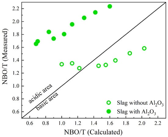 The relationship between calculated NBO/T values from slag compositions and measured NBO/T values from the deconvolution of Raman spectra, i.e., Equation (3). The slags with and without Al2O3 are represented by solid circles and open circles, respectively.