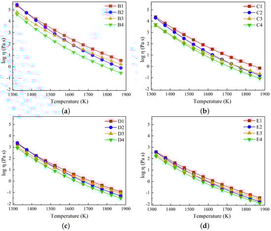 For slags in groups B to E, the variations in log are plotted as a function of temperature in Figure 9a–d. The viscosity decreases as the temperature increases for all slag compositions. Furthermore, slags in group B, characterized by the highest SiO2 content, have higher viscosity values compared to the corresponding slag compositions in other groups.