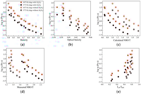 In Figure 10a–e, the variations in log are displayed against basicity, optical basicity, , , and the Raman R parameter (/), respectively, for two temperatures of 1673 and 1773 K. The slags with and without Al2O3 are indicated by solid circles and open circles, respectively. In general, as observed previously, the log values decrease as the basicity, optical basicity, and NBO/T values increase. However, in contrast to this pattern, the log values exhibit an increase with an increasing Raman R parameter, as depicted in Figure 10e. The R parameter serves as a representative measure of the polymerization degree within the silicate network, suggesting that an increased degree of polymerization corresponds to higher viscosity values. As shown in Figure 10c, the values for slags containing Al2O3 are smaller compared to those for slags without Al2O3. However, the viscosity values for slags without Al2O3 are larger than the viscosity values for slags with Al2O3, contrary to the expected trend. This deviation can be attributed to the fact that the calculation of NBO/T assumes that all Al2O3 acts as a network former in the presence of sufficient charge-balancing cations. However, the results of this study indicate that a fraction of Al2O3 acts as a network modifier. This network modifier leads to the depolymerization of the silicate network, resulting in a decrease in viscosity, as expected. The variations in the R parameter and log have similar patterns when plotted against basicity, optical basicity, and NBO/T parameters, particularly for slags containing Al2O3, as seen by comparing Figure 3 and Figure 10. This demonstrates the correlation between the Raman R parameter, structural chemical parameters, and viscosity, as reported in previous studies [23,43,44].