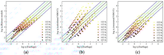 Comparison of viscosity values obtained from FactSage with viscosity values predicted by (a) the Raman-structure model, (b) the NBO/T model using values calculated from XRF composition, and (c) the NBO/T model using values obtained by Raman deconvolution analysis. The dashed lines represent a range of log units, while the solid lines represent a range of log units.
