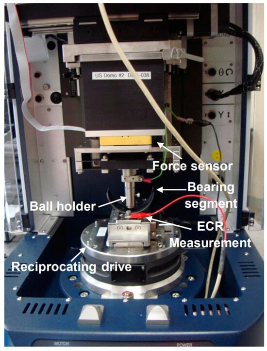 To assess the performance of the application, polymer coatings with an average thickness of 13 µm were applied to 1585 LC-coded bearings. Subsequently, the bearings were subjected to wear under a 20–30 N load and moved in reciprocating motion over a stroke length of 10 mm at a frequency of 3 Hz in the wear test configuration (UMT Tribolab, Bruker, Ettlingen, Germany) illustrated in Figure 4. A bearing segment specimen was mounted on the reciprocating drive, and a 6.35 mm diameter 100Cr6 ball was installed under the force sensor (see Figure 3). The surface roughness of the counter ball was specified to be below 0.80 Ra. Wear tests were performed using reciprocating motion, with the speed varying from 0.002 to 10 mm/s, and no lubrication was employed during the tests.