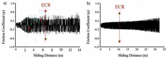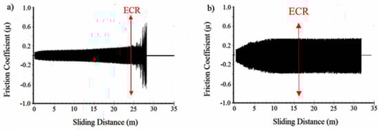 The variation in the coefficient of friction and ECR measurement (indicated by the red arrow) for the reference coating (a) and the NDP overlay (b) material tested under 30 N load.