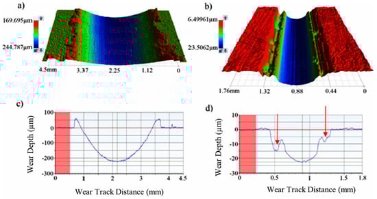 Three-dimensional wear track images of the reference polymer (a) and the NDP overlay (b) after wear tests under 30 N also displaying the depth of worn surfaces at (c) and notable breaks in the side walls of the wear path (red arrows) (d), respectively.