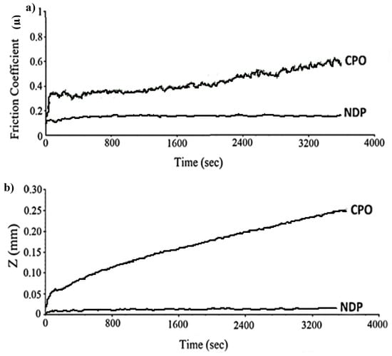 The relatively lower coefficient of friction in the NDP coating resulted in less wear loss compared with the reference coating. According to the data in Table 2, the reference polymer coating exhibited significantly higher volumetric wear loss compared with the NDP polymer top coating, more than double that of the NDP polymer top coating.