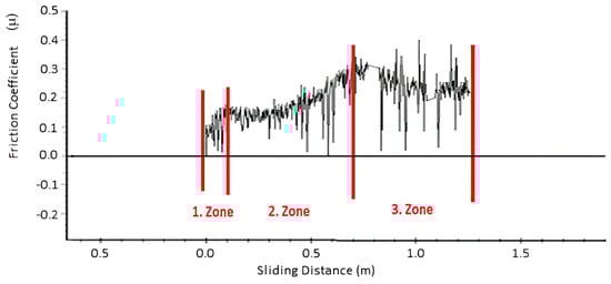 The change in the COF as a function of wear distance when the reference polymer coating initially comes into contact with a ball under a 30 N load (1st zone), depicting the region where it functions in harmony with the ball (2nd zone) and the point at which it completely separates from the wear surface (3rd zone).