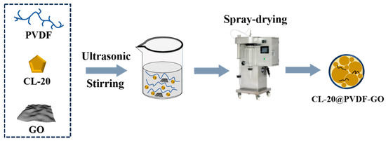 Scheme of preparation of CL-20@PVDF microspheres employed by spray drying method (GO as a catalyzer was a sample).