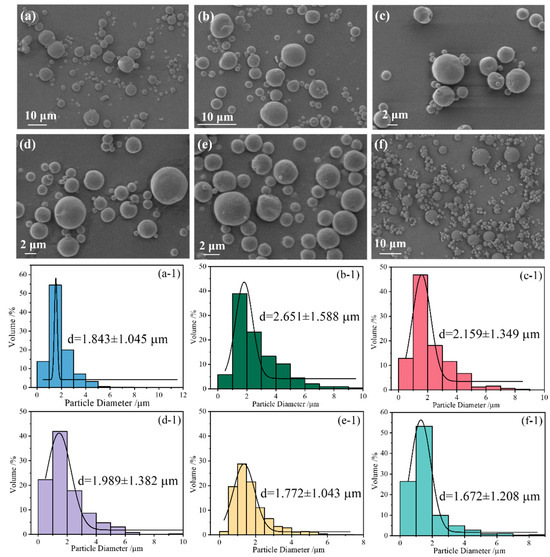 The images of CL-20@PVDF microspheres ((a) CL-20@PVDF; (b) CL-20@PVDF-CNT; (c) CL-20@PVDF-GO; (d) CL-20@PVDF-GCCo; (e) CL-20@PVDF-GCNi; (f) CL-20@PVDF-1 and the weight ratio of CL-20: PVDF = 1:1) and size distributions ((a-1) CL-20@PVDF; (b-1) CL-20@PVDF-CNT; (c-1) PVDF-GO; (d-1) CL-20@PVDF-GCCo; (e-1) CL-20@PVDF-GCNi; (f-1) CL-20@PVDF-1).