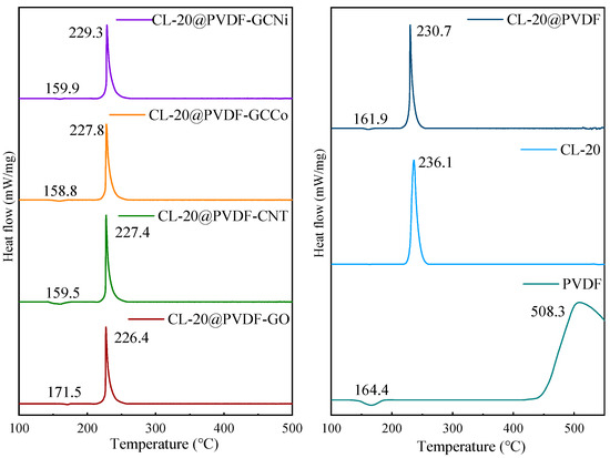 In the DSC curve of CL-20@PVDF (Figure 4), there is one endothermic peak at around 160 °C, which represents the melting of PVDF. An exothermic peak at 236.1 °C followed, owing to the thermal decomposition of CL-20. With the same result as DTG, the addition of PVDF can catalyze the decomposition of CL-20 by reducing the initial and peak temperatures. It assumed that the presence of PVDF may have a dissolving effect on decreasing crystal lattice stabilization [34]. Concerning the influence of nanocarbon materials, GO has a stable effect on the endothermic process, whereas the others would catalyze this process. In the case of the exothermic reaction of CL-20@PVDF, four kinds of nanocarbon materials have a catalytic influence on the decomposition of CL-20@PVDF by decreasing the peak temperature of the exothermic reaction. Additionally, all four types of nanocarbon materials could prolong the reaction process of CL-20 by increasing the temperature interval. It is suggested that the additive would slow down the heat release process.