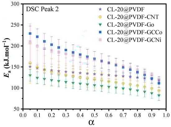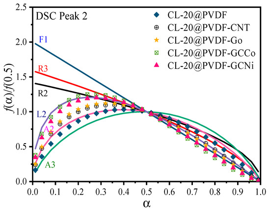Since the reaction process of energetic materials is always followed by an n-order reaction, other more precise calculations would be used. The Friedman method has been used to express the relationship between the conversion rate (α) and activation energy (Ea). As shown in Figure 5, the Ea value of involved CL-20@PVDF particles decreases as the conversion rate increases, which suggests that the autocatalytic reaction occurred during the thermal decomposition process. For the degree of conversion of α < 0.15, the apparent activation energy of CL-20@PVDF-CNTs is larger than that of CL-20@PVDF, then Ea keeps a lower value with increasing α. The Ea values of CL-20@PVDF-GO were reduced compared with CL-20@PVDF in the process. For CL-20@PVDF-GCCo and CL-20@PVDF-GCNi, the Ea values are very high initially and then drop rapidly. In order to compare the catalytic effect of different additives on CL-20@PVDF decomposition, the average Ea (0.3 < α < 0.7) was obtained, and the results are shown in Table 3. The Ea values of CL-20@PVDF-CNT, CL-20@PVDF-GO, CL-20@PVDF-GCCo, and CL-20@PVDF-GCNi were 120.5, 106.6, 169.4, and 167.1 kJ mol−1, respectively. It increases by −12.8, −26.7, 36.1, and 33.8 kJ mol−1 compared with CL-20@PVDF. For the Friedman method, the presence of CNTs and GO would reduce the Ea; however, GCCo and GCNi showed a reverse effect. For CL-20@PVDF-GCCo and CL-20@PVDF-GCNi, their value difference of Ea was too large as the change of α. Thus, the combined kinetic method is used to evaluate the reaction model of the composites.