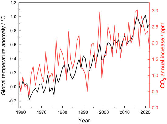 Currently, there is an increasing concentration of greenhouse gases (GHGs) in the atmosphere caused by anthropogenic activities, leading to global warming [1], especially due to CO2 and CH4. Correlations between the annual increase in temperature and GHGs have been analyzed over the years by many research centers, including NASA [2,3,4]. Figure 1 shows the chart of global temperature anomalies, which are deviations from a reference value or long-term average, and the increasing CO2 emissions in the period from 1959 to 2022. Despite the ten-year variation of some tenths of degrees, it must be considered that even 1 or 2 °C can have a huge impact on the global environment [5].