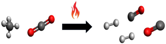 In the dry reforming of methane, CO2 and CH4 react to obtain a syngas rich in CO and H2 [17]. The DRM reaction was studied for the first time by Fischer and Tropsch in 1928 using nickel and cobalt catalysts, and nowadays, it is proposed as a potential solution to convert CO2 on a large scale [8,18]. Equation (1) reports the DRM reaction and Figure 2 schematizes the DRM reaction promoted by a source of heat. The main characteristics of the DRM are that, according to the thermodynamics [19], it may yield a H2/CO ratio close to unity and is highly endothermic, so high temperatures (>650 °C) must be used to promote the DRM reaction, even in the presence of a catalyst [18].