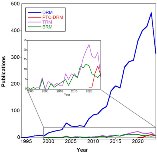 Publications trends over the years of “DRM”, “PTC-DRM”, “BRM” and “TDRM” (source: Scopus: 5 July 2024).