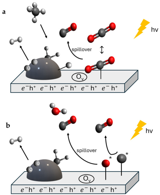 Simplified mechanism of PTC-DRM. (a) Activation of methane; (b) activation of carbon dioxide. The symbol * indicates the species adsorbed on the surface of the catalyst. Ov stands for oxygen vacancy.