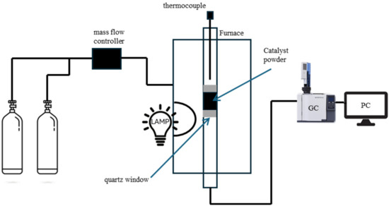 In this representation, a reactor containing the catalyst is positioned inside a tubular vertical furnace and a source of light is used to promote the DRM reaction. After conversion, the produced gases are analyzed by a gas analyzer.