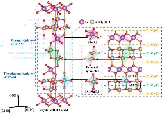 SCAM has a crystal structure of YbFe2O4 and consists of a hexagonal crystal system with the spatial group, with each crystal cell containing three SCAM molecules, as shown in Figure 1. Sc3+ occupies the position of Yb in the YbFe2O4 crystal structure, forming an octahedral structure with six O2− ions, and Al3+/Mg2+ randomly occupies the position of Fe in the YbFe2O4 crystal structure, forming an [Al/MgO5] triangular bipyramid structure of five O2− ions [23]. SCAM is considered a type of (RAO3)n(MO)m group oxide (n = m = 1 for SCAM; R3+ indicates rare-earth metallic elements such as In/Lu/Y/SC; A3+ can consist of metallic elements such as Fe/Ga/Al; and M2+ can consist of metallic elements such as Mg/Co/Cu/Zn) [24]. SCAM tends to cleave along the (0001) plane, making it challenging to obtain a high-quality wafer surface. Two types of Al/Mg-O bonds will result in two different (0001) planes, as represented by [Al/Mg-O]1 and [Al/Mg-O]2, respectively. SCAM can cleave at [Al/Mg-O]1, mainly due to weak interconnections between the layer of [ScO6] and [Al/MgO5] by O2- irons [25]. SCAM can also cleave at [Al/Mg-O]2, mainly due to the reverse symmetry that can cancel the electric dipole moment and surface charges [26].