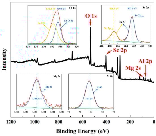 X-ray photoelectron spectroscopy spectra of the SCAM wafer before polishing. The peaks of Sc 2p, Mg 2s, Al 2p, and O 1s were calibrated with C 1s (284.4 eV) as the standard. The insets show the high-resolution spectrogram of the elements Sc 2p, Al 2p, Mg 2s, and O 1s, with peak fitting by Avantage software (Ver. 6.6.0).