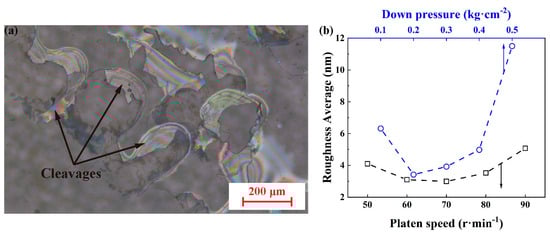 (a) Metallographic microscope image (BH200M, Sunny Optical Technology Group Co., Ltd., Yuyao, China) of SCAM surface after polishing under platen speed of 80 r/min and down pressure of 0.5 kg/cm2, (b) effects of down pressure (under a fixed platen speed of 80 r/min) and platen speed (under a fixed down pressure of 0.2 kg/cm2) on roughness average Ra.