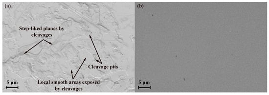 Figure 4a,b compare the scanning electron microscopy (SEM) images of the SCAM surfaces before and after polishing under a platen speed of 80 r/min and a down pressure of 0.2 kg/cm2. Step-like cleavage planes, cleavage pits, and local smooth areas exposed by cleavages can be observed on the initial surface of the easily cleaved SCAM, as shown in Figure 4a. The rough surface of the SCAM wafer becomes smooth and without cleavages after polishing under optimized conditions, and the polished surfaces are suitable for subsequent nanoindentation and microscratch tests.