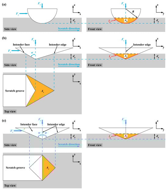 Instrument scratch tests were performed on an MST2 (Anton Paar, Graz, Austria) microscratch tester equipped with acoustic emission (AE) [31], and three different types of indenters were used, namely a diamond Berkovich indenter with a face angle of 65.27° (resulting in the same ratio of the projected contact area over the contact depth as the Vickers indenter) [32], a diamond Vickers indenter, and a spherical indenter made of steel (i.e., 100Cr6) with a radius of 500 μm. Tests were conducted on the plane that had a deviation of 16°12′ degrees from the (0001) plane (i.e., the 10 × 10 mm2 surface of the wafer) of SCAM with a scratch direction parallel to one side of the 10 × 10 mm2 surface. The scratch distance was 3 mm, and the thrust was in the edge-forward direction for the sharp indenters. The normal load Fv was progressively increased from the initial 5 mN to three different maximum loads (i.e., 0.5 N, 5 N, and 25 N) within 30 s in the scratch tests with a spherical indenter at a scratch speed of 6 mm/min. Four different scratch speeds (i.e., 3, 6, 12, and 18 mm/min) were applied in the microscratch tests using Berkovich and Vickers indenters, and the normal load Fv was progressively increased from the initial 5 mN to a maximum of 500 mN. Since the scratch speed was much lower than the processing speeds during grinding and polishing, the thermal effect was negligible. The scratch test consisted of four steps [33]: (1) the initial surface profile or sample tilt of the SCAM wafer was measured during the pre-scan phase under a small vertical load of 5 mN, whose effect on plastic deformation was negligible [34]; (2) scratching under the prescribed conditions; (3) post-scan under a small vertical load of 5 mN, and the residual depth could be obtained; and (4) capture of scratch morphology by optical microscopy [35]. The residual scratch morphologies obtained by optical microscopy were synchronized with the variations of scratch variables, such as penetration depth dp representing total deformation, residual depth dr representing plastic deformation, friction coefficient μ (i.e., the ratio of lateral force over normal load), and acoustic emission (AE) during scratching as Fv increased [36]. The horizontally projected contact area Ah and the vertically projected contact area Av for different indenters are illustrated in Figure 5 and [37]: