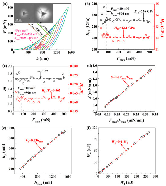 Figure 6d shows the proportional relationship between the contact stiffness S and Fmax/hmax, which could be used to continuously measure S with the load and displacement measured during the loading segment without the need of unloading, resulting in determining both HIT and EIT under different loads (or penetration depths) from only one loading test [44].