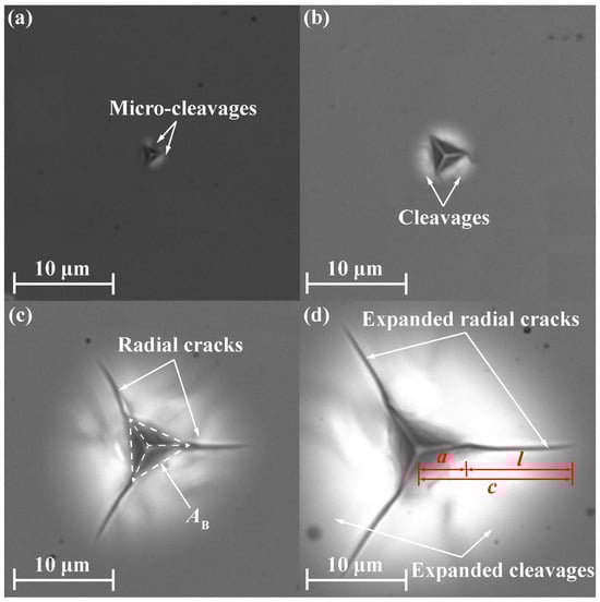 The residual indentation morphologies of SCAM at four different loads are shown in Figure 7a–d. Only micro-cleavages were found on the wafer surface under small loads, see Figure 7a for Fmax = 30 mN. Obvious cleavages were observed at the edges of the residual imprint under relatively large loads, see Figure 7b for Fmax = 100 mN. Radial cracks initiated from the three vertices of residual imprints by the Berkovich indenter under sufficiently large loads, see Figure 7c for Fmax = 250 mN. As Fmax continued to increase, radial cracks and cleavages expanded, see Figure 7d for Fmax = 400 mN.