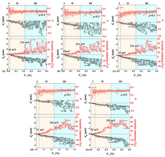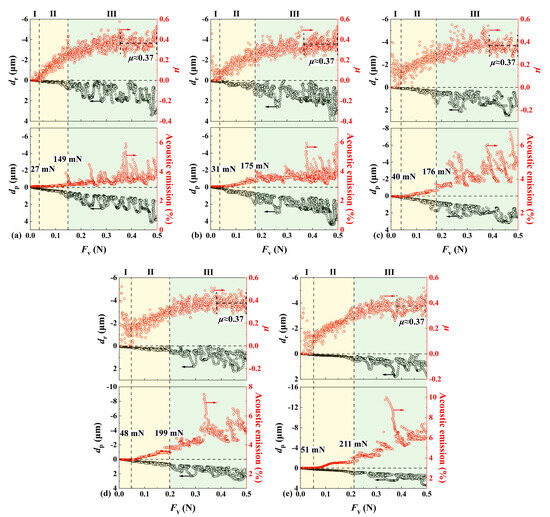 Variations of scratch variables with the applied normal load Fv during scratching by a Berkovich indenter under a progressive load linearly increasing from 5 mN to 500 mN and different scratch speeds: (a) 3 mm/min; (b) 6 mm/min; (c) 9 mm/min; (d) 12 mm/min; and (e) 18 mm/min. The critical loads indicating the two transitions from regime I to regime II, and from regime II to regime III, respectively, are denoted by vertical dotted lines.