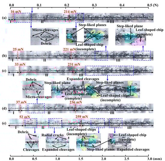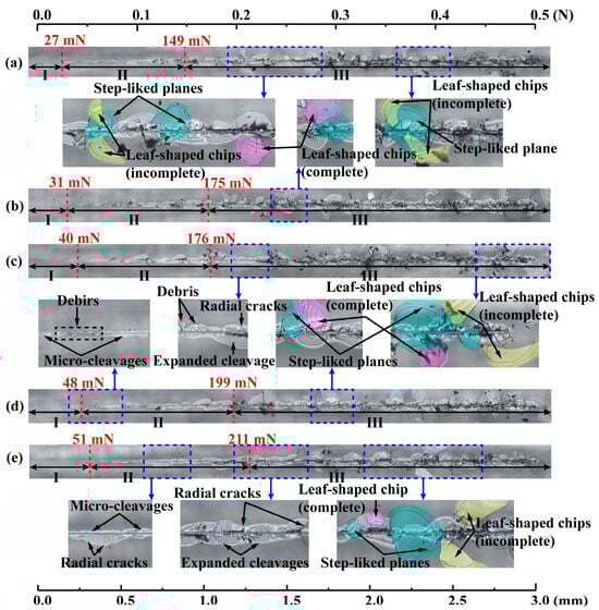 Optical images of residual scratch morphologies by a Berkovich indenter under progressively increasing load from 5 mN to 500 mN and different scratch speeds: (a) 3 mm/min; (b) 6 mm/min; (c) 9 mm/min; (d) 12 mm/min; (e) 18 mm/min. The step-like planes, marked by a blue color, are generated by the peeling off of complete (purple color) and incomplete (yellow color) leaf-shaped chips. The critical loads Fc1 and Fc2 determined by the variations of scratch variables in Figure 8 are displayed as red dotted lines.