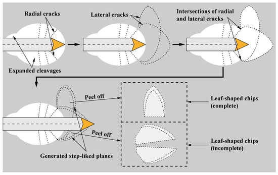 The generation mechanism of leaf-shaped chips and the corresponding step-like planes by a sharp indenter (e.g., Berkovich and Vickers indenters) is shown in Figure 12. Radial cracks, which occur together with the expanded cleavages, can intersect with lateral cracks that extend upwards to the surface of the sample under large loads [7], forming leaf-shaped areas to be delaminated (i.e., generation of leaf-shaped chips) due to the easily cleaved characteristics of SCAM. When the sharp indenter scratched through the leaf-shaped area in front of the indenter, the leaf-shaped chip was divided into two halves. When the leaf-shaped area was generated on the side of the scratch, and was peeled off from the sample, a complete leaf-shaped chip was generated. The step-like planes were exposed fresh surfaces after peeling off of the leaf-shaped chips.