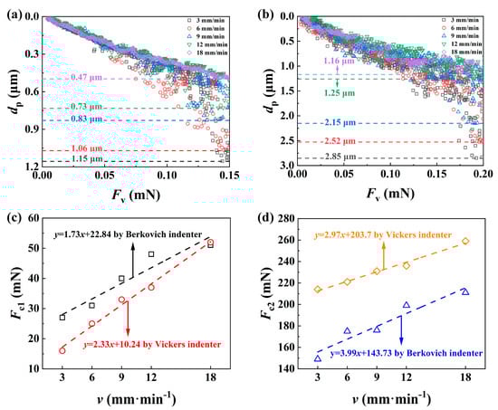 Figure 13a,b compare the penetration depth dp of SCAM under different scratch speeds using the Berkovich indenter under the maximum applied Fv = 150 mN and using the Vickers indenter under the maximum applied Fv = 200 mN, respectively, since the data of dp become very scattered under large loads due to severe damage. A higher v tends to produce a smaller dp, which has been widely reported in the literature, and increasing the scratch speed can reduce the penetration ability of the indenter [49,50], resulting in a greater applied load for the same penetration effect under a lower scratch speed. Figure 13c,d show the effects of scratch speed on the two critical loads Fc1 and Fc2, respectively, and both Fc1 and Fc2 increased in an approximately linear way as the scratch speed increased for both indenters, since a larger v resulted in a smaller dp and thus less damage, which corroborates the fact that increasing the platen speed within a certain range during polishing can reduce Ra of the material, see Figure 3b.
